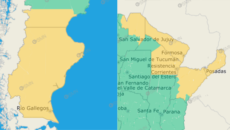 Mientras tanto, en el sur del país, puntualmente en la franja sur de Chubut y en la totalidad del territorio de Santa Cruz, está emitido desde las 6:21 de este martes una alerta amarilla por fuertes vientos. Desde el organismo informaron: «el área será afectada por vientos fuertes del sector oeste, con velocidades entre 40 y 60 km/h y ráfagas que pueden superar los 90 km/h».