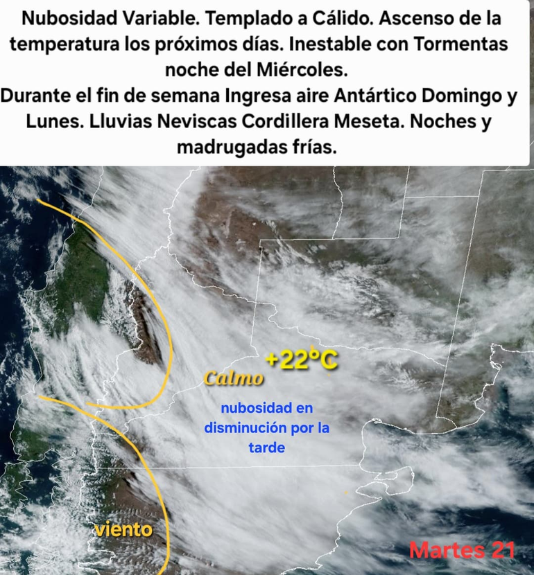 En tanto que, la Autoridad Interjurisdiccional de las Cuencas (AIC) anticipó que se mantendrá la variabilidad en el estado del tiempo en toda la región por la alternancia de aire cálido y húmedo con el ingreso de pulsos fríos. Pronosticó períodos inestables con formación de tormentas. Anticipó que durante el fin de semana ingresará aire polar con lluvias y nevadas en cordillera. También que habrá lluvias y neviscas en meseta, centro de Neuquén y Río Negro entre el domingo y el lunes. Habrá altas presiones con noches y madrugadas frías en el comienzo de la semana.