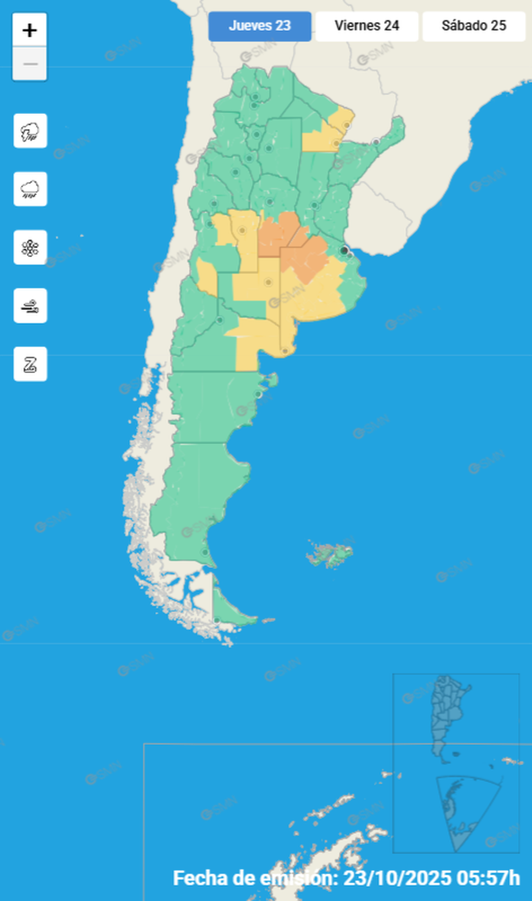 Por otro lado, el SMN precisó que para este jueves está vigente otra alerta de nivel naranja, donde algunas áreas de tres provincias se verán particularmente afectadas. El sur de Córdoba, sur de Santa Fe y noroeste de Buenos Aires están bajo esta advertencia