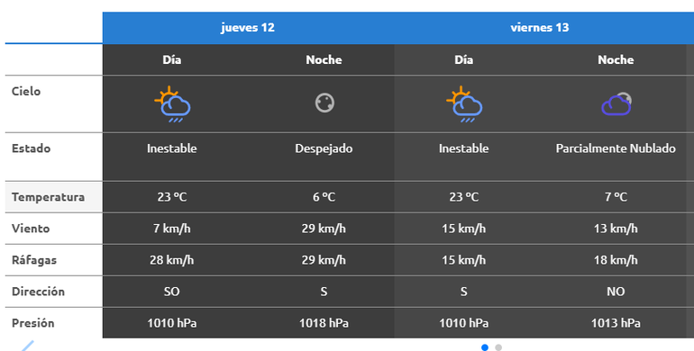 Para el viernes, se esperan condiciones similares en máximas y mínimas, así como también en inestabilidad, mientras que el viento irá disminuyendo.