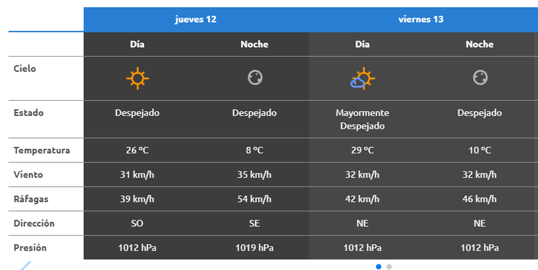 Para el viernes, se espera una temperatura máxima de 29 grados y una mínima de 9 grados, con cielo mayormente cubierto. El viento será del oeste, con velocidades cercanas a los 18 km/h y ráfagas de hasta 42 km/h durante el día y hasta 46 km/h durante la tarde y noche.